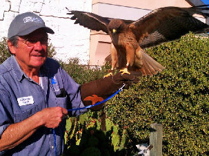 Retired in 2010, David Neffew at Living Coast Discovery Ctr w/ partially blind, Red Tail Hawk. David is a volunteer at this SoCal nature center.